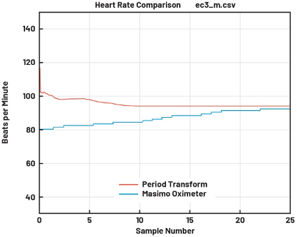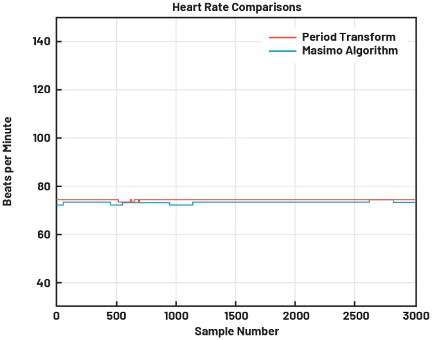 图9.比较来自MAX30101血氧仪(采用离散周期变换进行处理)和Masimo血氧仪的心率数据。