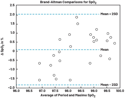 图10.Masimo血氧仪与使用DPT算法的ADI血氧仪的SpO2百分比差异。满足Bland-Altman标准。