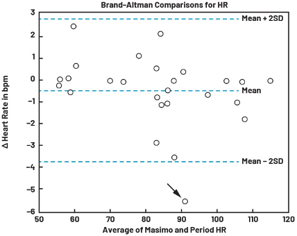 图11.Masimo血氧仪与使用DPT算法的ADI血氧仪的每分钟心率差异。除一个案例外,其他所有案例均满足Bland-Altman标准。箭头标示了超出两个标准差范围的分析结果。