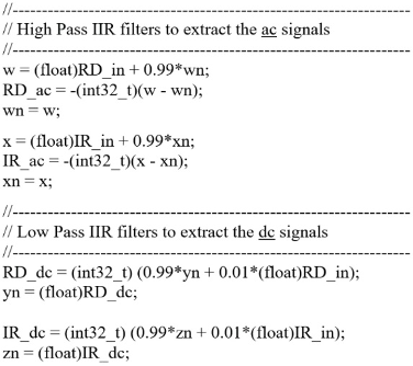 通过一阶低通IIR滤波器从原始信号中提取红光和红外直流信号;通过一阶高通IIR滤波器提取交流信号。参见图14。这些滤波器的时间常数设置为大约1秒。数据以100 SPS的速率采样,并以MAX30102的中断作为定时信号。对于红光和红外信号,该器件的输出均为12位定点数字格式。