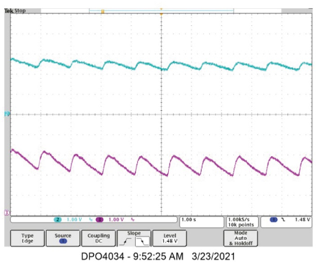 图15.树莓派Zero血氧仪原型产生的PPG波形,上方为红光脉冲,下方为红外脉冲。心率约为58 bpm。图中所示为倒置的波形,以便更准确地表示手指中的实际动脉压力。