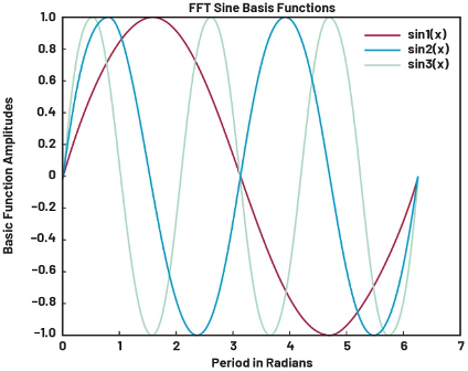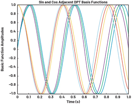 图2.三个相邻正弦函数和三个相邻余弦函数的周期变换复正弦基函数。此示例假设这些函数的采样时间间隔为10 ms。