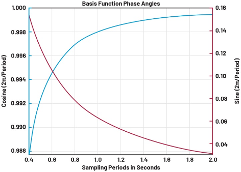 图3.周期变换基础相位角,展示了复相位角的值如何随着每分钟采样周期数的增加而变化。上升曲线表示余弦相位角,下降曲线表示正弦相位角。
