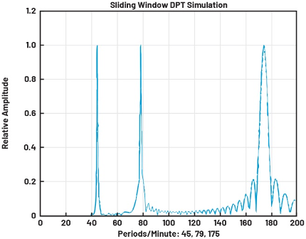 最初,我们开发了一种算法来执行某种形式的自相关和系综平均处理4。然而,我们很快发现,时域中的系综平均并无必要,因为所有相关的信息都可以在周期域数据本身中找到。心率和血氧饱和度可以直接根据滑动离散周期变换(DPT)产生的结果计算出来。