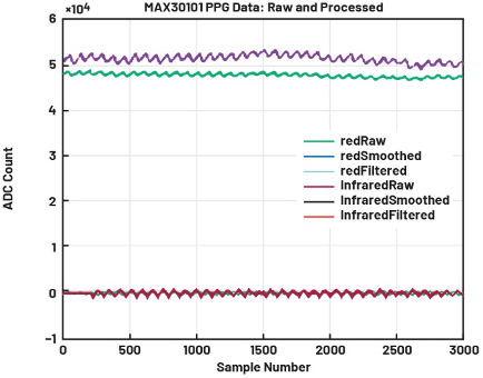 图6.使用MAX30101 PPG AFE器件从某位受试者获取的原始光电容积脉搏波数据、经滤波的数据和经平滑处理后的数据。上方波形表示原始红外和红光信号,而下方波形表示经过滤波和平滑处理的数据。