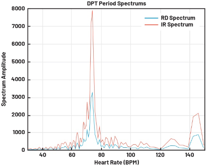 红光和红外交流信号通过滤波器提取出来之后,就交由DPT处理,而无需任何进一步的信号预处理。光谱信号的第一谐波产生的峰值如图16所示。心率由横坐标上数据峰值的位置决定,而SpO2通过比率之比公式使用红光和红外数据峰值的幅度直接计算。