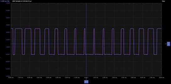 输出信号是输入电压的PWM表示。请注意,通过改变电位计值,信号占空比会发生变化,而频率保持不变。