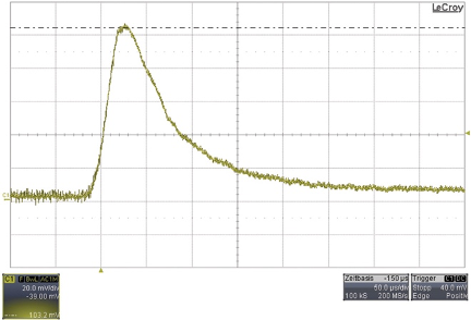 图3显示了在负载瞬态响应期间交流耦合输出电压中的电压尖峰,其测量设置如图1所示。峰值电压约为103 mV。相比之下,图4显示了连接线的导线整齐绞合在一起(如图2所示)时的测量结果。此时,输出电压中的电压尖峰只有大约96 mV。这相当于大约7 mV的差异,它表明连接线的整齐排列可导致该负载瞬态测试结果改善大约7%。