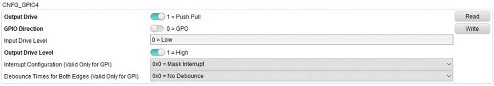 每个GPIO实例都有一个相关寄存器CNFG_GPIOx,该器件负责选择方向GPO/GPI、输出类型(开漏/推挽)和输出驱动电平(若为GPO),以及输入驱动电平、中断行为和去抖动配置(若为GPI)。