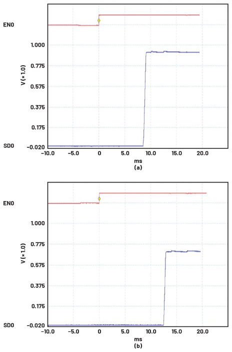 现在,当MAX77714使能时,EN0置为高电平,SD0将按照编程设定,以0.7 V在时隙2上电。图14为寄存器写入之前上电(a)和寄存器写入之后上电(b)的情况。