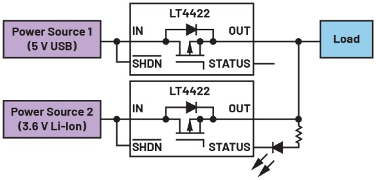 图2所示的电路有两个理想二极管,由两个LT4422器件来执行理想二极管的功能。在这些集成电路中,由于电源路径中的电阻较低,只有50 mΩ,因此压降也很低。IC自身的功耗仅为10μA,进一步降低了总功耗。图2还显示了一个附加功能。可添加LED作为指示灯,用于在任何给定时间指出哪个电压源正在为负载供电。