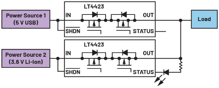 在图3所示的电路设计中,可自由确定电源电压来为负载供电。因此,电源的选择与电源电压的相应电平无关。然而,由于需要两个集成的MOSFET,因此在导通时,电源路径中的电阻从50 mΩ (LT4422)增加到了200 mΩ (LT4423)。