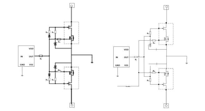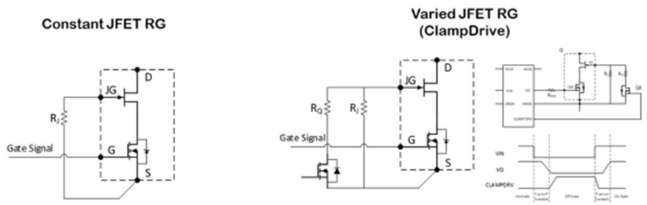 图6 开关模式应用中 Combo JFET的控制方法(左:恒定 JFET 栅极电阻,右:ClampDRIVE)