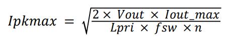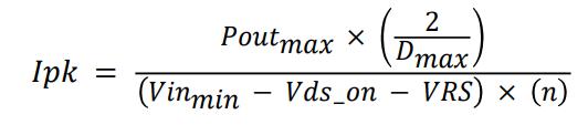 接下来,使用方程式 2 估算变压器的峰值初级电流 Ipk。对于方程式 2 中的 FET 导通电压 (Vds_on) 和电流检测电阻电压 (VRS),假设一些适合您设计的小压降(如 0.5V)。您可以稍后更新这些压降。