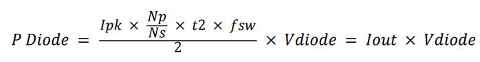 方程式 17 表明该设计中的二极管损耗将大大降低。务必选择一个额定次级峰值电流的二极管,该电流通常远大于 IOUT。