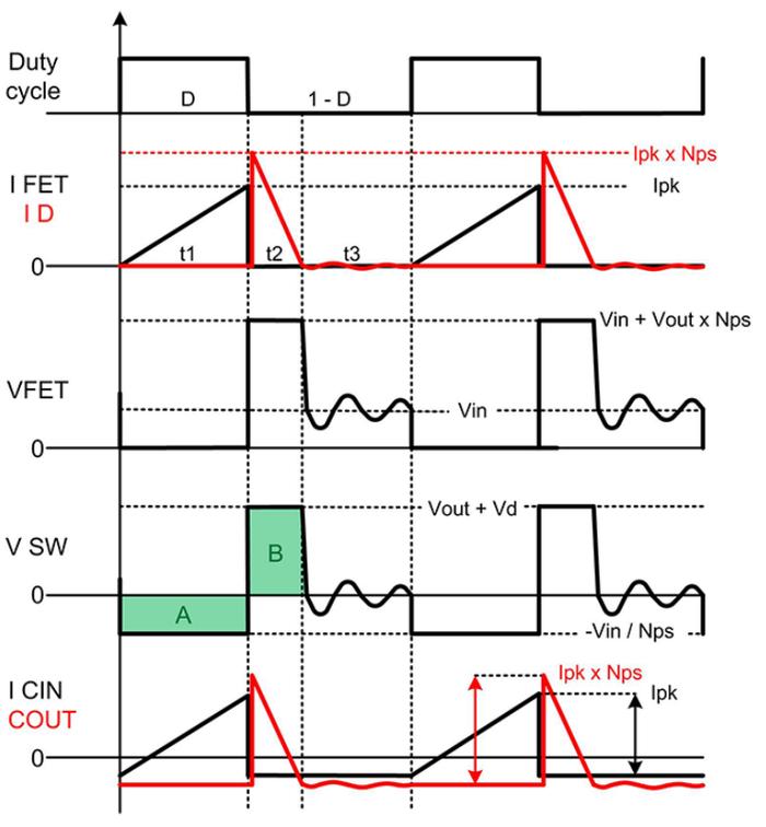 图 2 中的阴影区域 A 和 B 突出显示了变压器在 t1 和 t2 期间的伏微秒积,它们必须保持平衡才能防止饱和。区域“A”表示 (Vin/Nps) × t1,而“B”表示 (Vout + Vd) × t2,两者均以次级侧为基准。Np/Ns 是变压器初级/次级匝数比。
