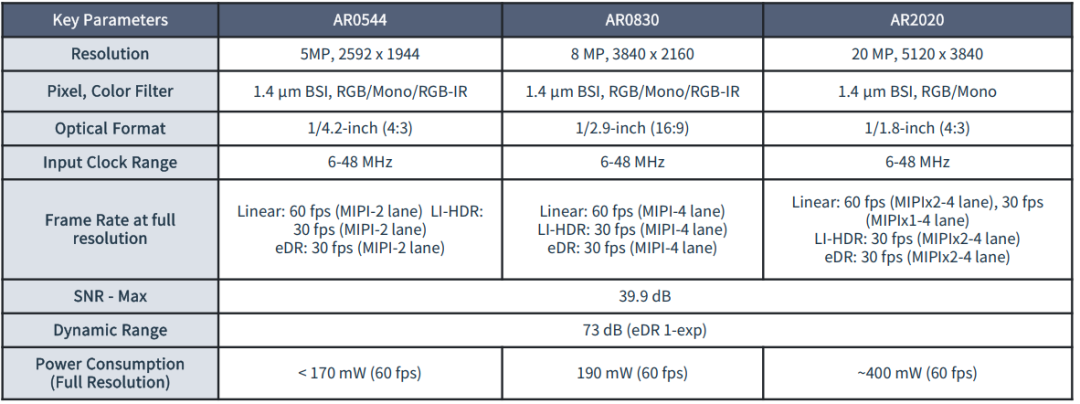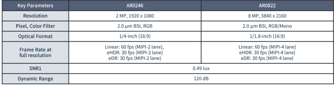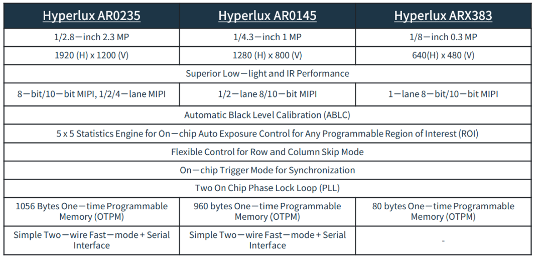 最近, 安森美推出了 Hyperlux LP 系列图像传感器。该系列采用了先进的电子卷帘快门技术,包含三种产品型号: 500万像素的 AR0544、 830 万像素的 AR0830 和 2000 万像素的 AR2020。 Hyperlux LP 系列中的所有传感器都具有相同的像素大小和光学性能。这些产品线提供了多种选择,包括黑白、 RGB 和 RGBIR 型号,并有封装和裸片两种形式可供选择。