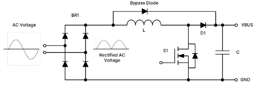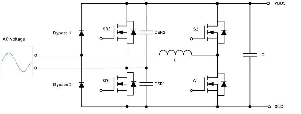 在大功率应用中,输入电桥损耗明显更高。用Si 或SiC MOSFET 等有源开关取代二极管,可以降低功率损耗。半无桥PFC 和图腾柱PFC 拓扑非常流行,它们可以省去桥式整流器,从而减少损耗。