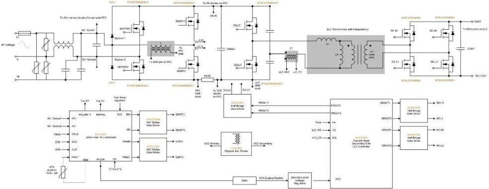 基于MOSFET的图腾柱PFC级通过去除笨重且损耗大的桥式整流器,提高了效率和功率密度。安森美的650V EliteSiC MOSFET非常适合图腾柱PFC的高频支路。安森美650V EliteSiC MOSFET如NTH4L045N065SC1和NTH4L032N065M3S适合3.0kW的应用;NTH4L015N065SC1和即将上市的NTH4L012N065M3S适合6.6kW的应用。NTHL017N60S5H则适用于图腾柱PFC的低频支路。 (图 5显示了基于SiC的 3 kW图腾柱 PFC和 LLC电源的示例)。