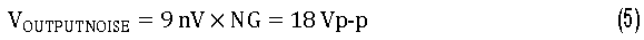 跨阻放大器的输入噪声通过噪声增益在输出端放大。对于本电路,只需关注低频噪声,因为传感器工作频率极低。ADA4528-2的0.1 Hz至10 Hz输入电压噪声为97 nV p-p;因此,输出端噪声为18 μV pp,如公式5所示。