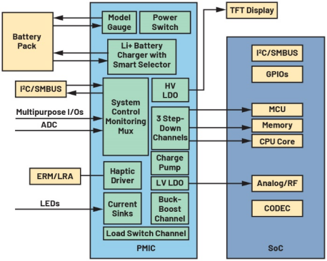 分立电源管理方案需采用多个独立元件,如单独的降压转换器、低压差稳压器(LDO)、电池充电器及保护电路等,每个元件各司其职。这种方案虽能灵活选用贴合具体规格的元件,但往往导致PCB尺寸增大、设计复杂度居高不下,且热管理与电磁干扰(EMI)控制难度增加。相比之下,PMIC将多种电源功能集成于单个芯片之中,大幅缩减了电路板空间,简化了设计流程,还提升了系统整体效率。图1展示了传统分立电源管理与PMIC解决方案的差异,凸显了集成化带来的种种优势。在可穿戴设备等空间受限的应用中,PMIC的优势尤为突出,这类应用对紧凑性、低功耗及精简的上电时序控制的要求非常严苛。此外,PMIC通常内置电源监控、故障保护及通信接口等高级功能,而这些在分立方案中往往需要额外电路才能实现。总体而言,分立方案或许适用于高度定制化或大功率系统,但对于现代紧凑型电子设计,PMIC无疑是更高效、更可靠的理想之选。