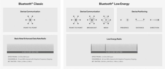 图1.(a)经典蓝牙和(b)低功耗蓝牙规范要点2
