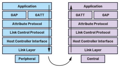 典型的BLE应用由两个设备组成:外围设备和中心设备。在建立连接之前,外围设备会通过一个称为BLE广播的过程对外宣告自身的存在。中心设备会扫描可用的外围设备。一旦中心设备找到所需的外围设备,两者之间就会建立连接。然后,每个设备中的应用可以通过BLE协议栈的不同层传输数据,实现相互通信。参见图3。