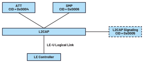 主机层包含BLE协议栈的其余上层协议,具体包括逻辑链路控制与适配协议(L2CAP)、安全管理器协议(SMP)、属性协议(ATT)、通用属性规范(GATT)和通用访问规范(GAP)。L2CAP作为上下层协议之间的通道接口,负责应用数据的分割和封装,并使用ACL链接传输数据包。L2CAP通过通道标识符(CID)和通道复用来正确定位设备上的端点。参见图5。