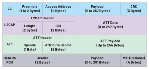 图10总结了BLE协议栈架构中各层的数据包格式,并概要显示了数据的结构。