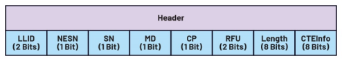 数据信道PDU标头包含以下字段:LLID、NESN、SN、MD、CP、长度和CTEInfo。
