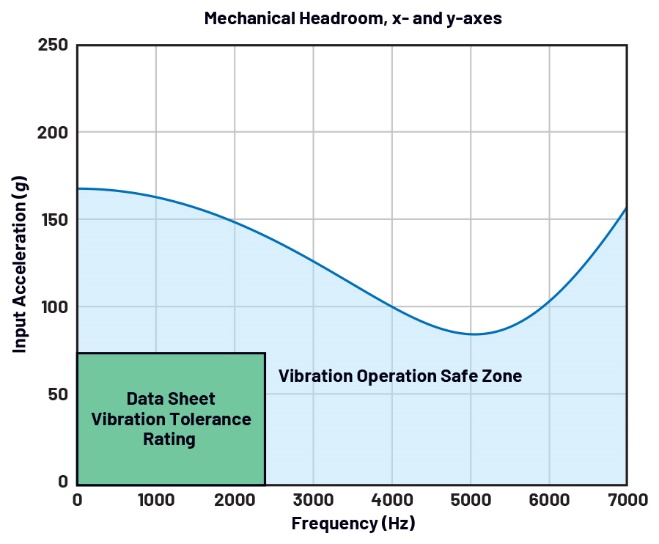 这有助于工程师了解检测质量块接触限位器前的余量大小,并了解传感器谐振频率与品质因数在其中所起的作用。当输入振动被品质因数机械放大时,振动频率越接近传感器谐振频率,机械余量就会有效降低。