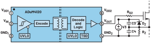 其中一个例子是使用隔离式驱动器ADuM4120。在这类应用中,功率器件由正电压(如V1)和负电压(如V2)驱动,如图1所示。