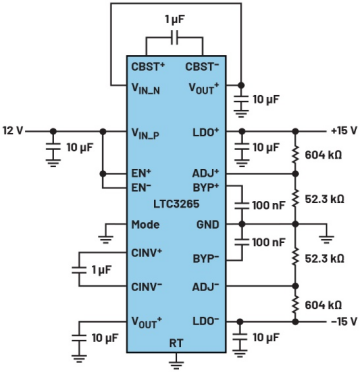 另外,考虑到需要低噪声/低电磁干扰(EMI)以避免对其他敏感电路产生干扰(尤其是对于医疗设备、传感和通信应用而言),ADI公司提供了诸如LTC3265之类的产品,在双电荷泵的每个输出端都集成了低噪声LDO稳压器(见图5)。虽然输出电流限制在50 mA,但这种解决方案对电磁干扰更为友好,并且仅用一个集成电路就集成了正输出轨和负输出轨。由于输出噪声极低,在驱动低功耗运算放大器和数据转换器的精密仪器仪表应用中,非常有用。