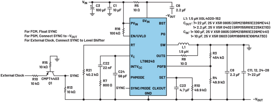 当典型的同步降压转换器的输出侧与电路接地进行切换时,就会产生一个反相降压-升压(IBB)转换器,如图6所示。这种方法很受欢迎,因为市面上有许多可供选择的同步降压稳压器或控制器。对于噪声敏感型应用,ADI的Silent Switcher®单片降压稳压器,例如采用Silent Switcher 3技术的LT8624S,可配置为IBB以产生具有出色的宽带和EMI噪声性能的负电压轨。图6显示了将LT8624S用作IBB的转换器的一个示例电路,详见“针对噪声敏感型应用的快速瞬变负电压轨”这篇文章。为了进行进一步的滤波处理,可以在输出端添加一个低噪声的负输入LDO稳压器。如果在使用这种拓扑结构时需要更高的功率,ADI公司有多种同步降压控制器可供选择,并且可以搭配外部FET使用。