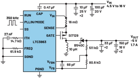 - 异步IBB:可以通过使用PMOS作为主开关,并采用二极管来替代同步开关,从而设计出异步IBB。这样一来,IC就可以参考系统接地,而无需电平转换器。在这种情况下,输出负载的正极侧连接到输入接地。这里的IC选项可以是如图7所示的LTC3863。它的效率通常比使用降压型IC要低,因为PMOS和二极管所产生的损耗,通常要比基于NMOS的同步转换器更大。