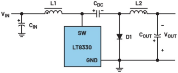 当需要考虑开关噪声问题时,CÜK转换器能够产生负输出电压,且其造成的噪声比IBB转换器要小。这种拓扑结构如图8所示,它包含两个电感器和一个耦合电容。这种转换器的优点在于其结构简单,仅需一个低端开关即可将输入电压反相,并且该开关可以是NMOS,因此效率很高。例如,LT8330仅需8个引脚,而且设计起来并不困难。此IC是ADI的稳压器之一,它集成了两个误差放大器,因而能够检测正输出电压或负输出电压。类似的稳压器,例如LT8331、LT8333、LT8334、LT8570和LT8580,提供了不同的额定参数和特性,以满足各种常见的应用需求。
