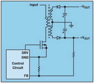 如果出于隔离目的而需要变压器(比如在反激式转换器中),那么只需在输出侧增加另一个绕组,就能非常容易地产生正负输出电压。在这个变压器上,通过设置多个绕向不同的绕组,并配合使用隔离二极管,就能够产生正电压或负电压,如图9所示。例如,LT8306无需使用光耦合器来进行反馈,从而节省了物料清单成本。