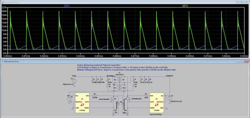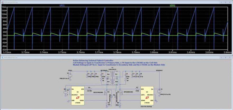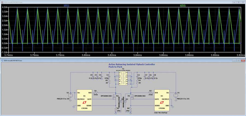 图2和图3展示了该架构中使用的反激电路的LTspice®原理图和相应的仿真结果。仿真清楚地表明,该电路实现了预期的电芯充放电双向均衡。