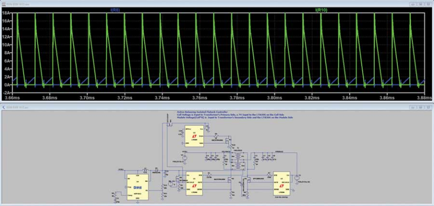 图4显示了采用ADP1612升压转换器和LT8309同步整流以实现主动均衡的反激电源级的完整LTspice仿真。