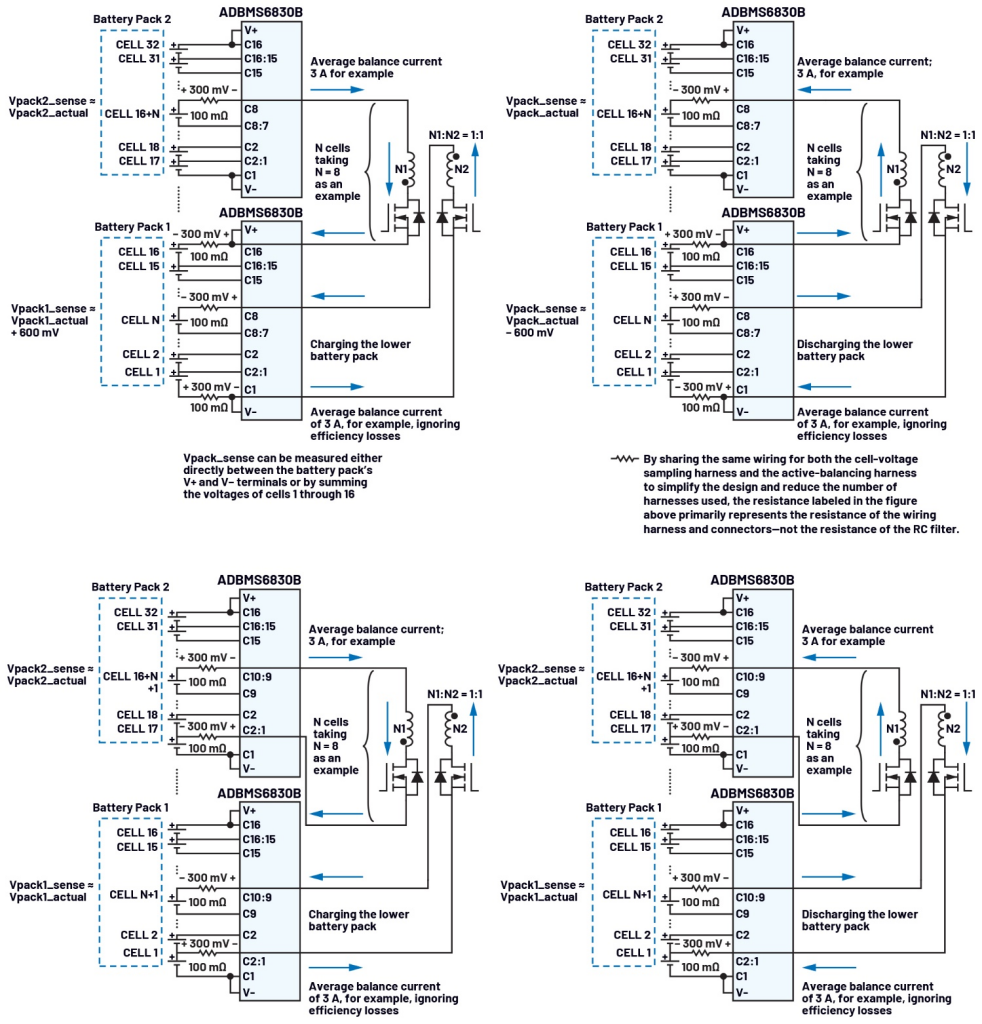 实施基于电压的电池包间均衡策略时,务必确保电池模组之间的均衡电流路径不经过电池包的主端子(V+和V-)。这种预防措施可防止干扰电池包总电压的测量,无论是直接在V+和V-之间测量,还是通过对电芯1至电芯16的各个电芯电压求和来计算。