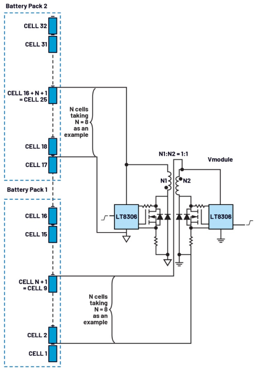 图9.架构中有两个反激电路:一个专用于电芯间均衡,另一个专用于电池包间均衡