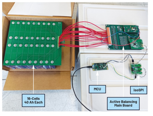 图11.在使用真实16电芯电池包(每个电芯的额定容量为40 Ah)的主动均衡实验中,该架构的物理接线和连接图