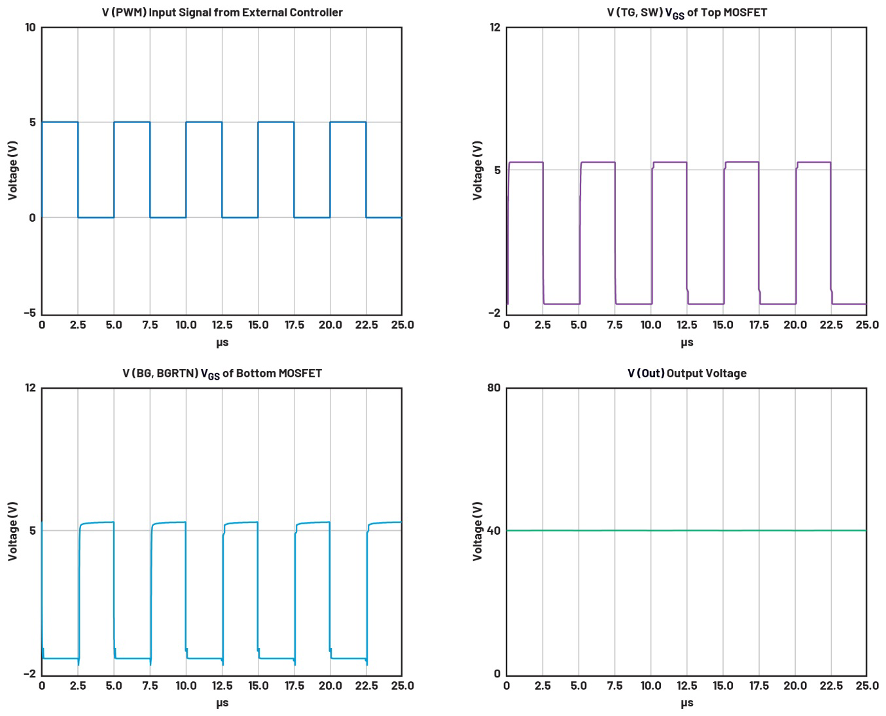 BST-SW和BGVCC-BGRTN电源自举确保高端和低端驱动器高效运行,而无需任何额外的隔离电源电压,进而能够减少电路板上的元件数量并降低成本。控制波形和平均输出电压结果如图2所示。