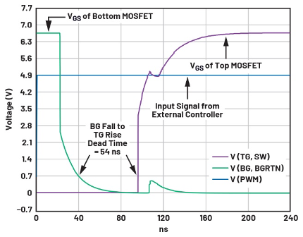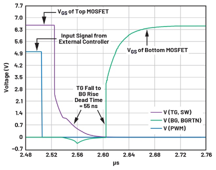 为了实现更高效率,尽可能降低开关损耗非常重要。高端和低端MOSFET驱动器的1.5 Ω上拉电阻和0.8 Ω下拉电阻快速接通或断开开关,防止电流交叉传导,从而提高效率。图3和图4显示了导通和关断之间的开关转换以及死区时间。