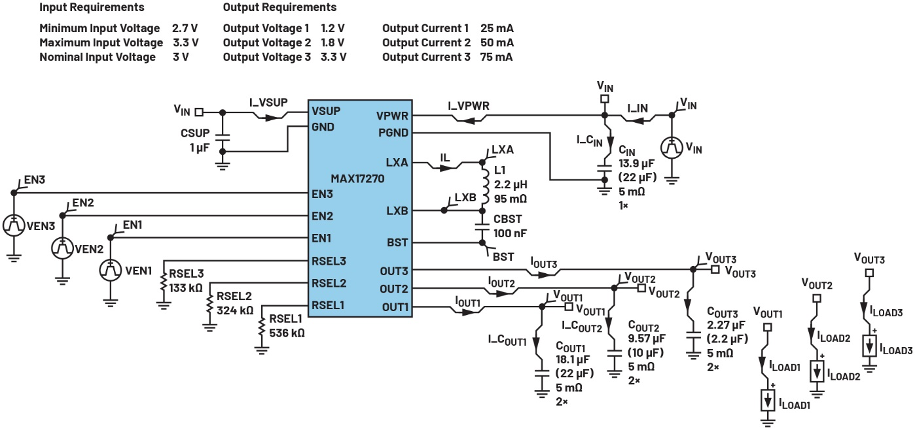图4. MAX17270 SIMO转换器配置为提供三个输出轨。