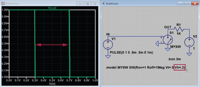 Vh为正值时,开关将表现出滞回特性。在Vswitch.asc示例中,将Vh更改为0.2 V,以展示相应的滞回效应。参见图10。