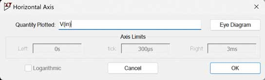 此外,我们还可以绘制开关行为与输入电压的关系图。删除V(in)迹线,然后右键单击x轴,将x轴从时间更改为V(in)。参见图8和图9。