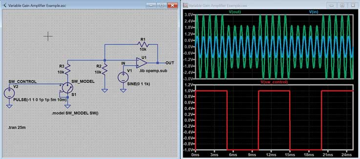 第二个例子的灵感来源于此处发布的电学实验室项目。借助理想运算放大器和开关模型,我们可以模拟该电路的简单版本。该示例原理图名为Variable_Gain_Amplifier_Example.asc。
