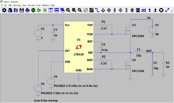 要想快速、高效地体验GaN开关的控制过程,强烈推荐使用免费的仿真环境LTspice。LTspice不仅包含LT8418 GaN驱动器的全面仿真模型,还配备了完整的外部电路。图3展示了用于在LTspice中进行评估的LT8418原理图。