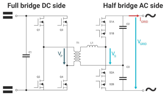 在本例中,直流侧实施全桥,在变压器 T1 的初级侧生成输入信号 VP。交流侧实施半桥配置(带电容分压器),模拟次级侧各段 VS 的交流输出 VGRID。